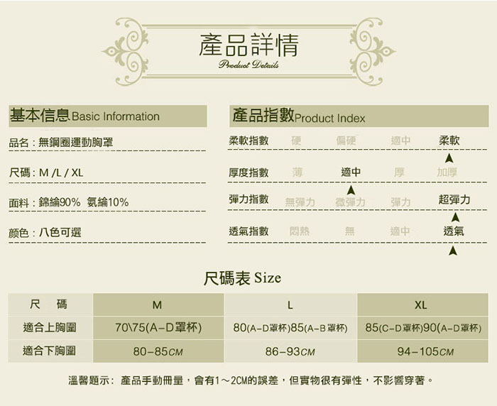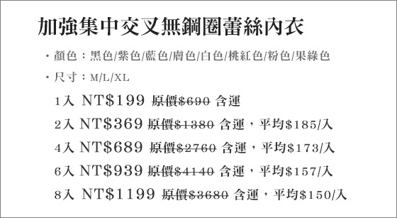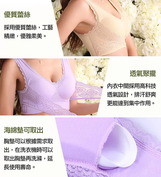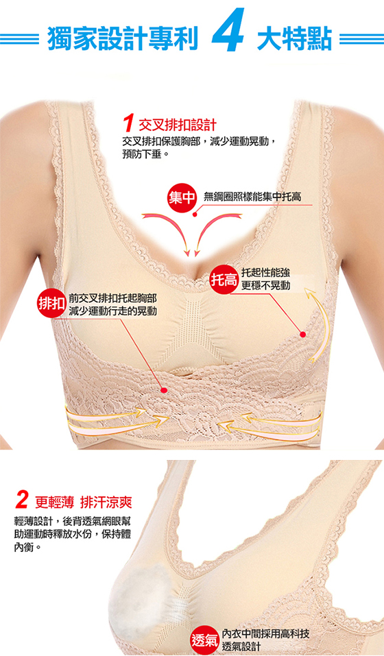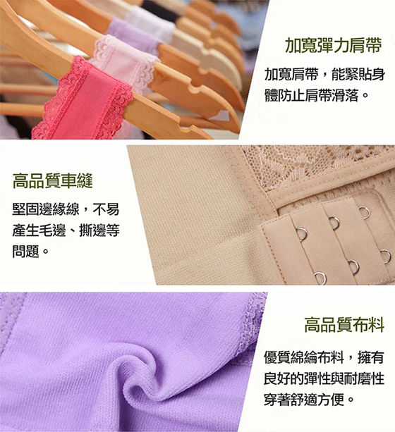 彌補一般無鋼圈內衣容易下垂、外擴等缺點,此款內衣加寬拉提設計,減輕背部壓力感,完美包覆副乳,防止胸部下垂,持久不變形。