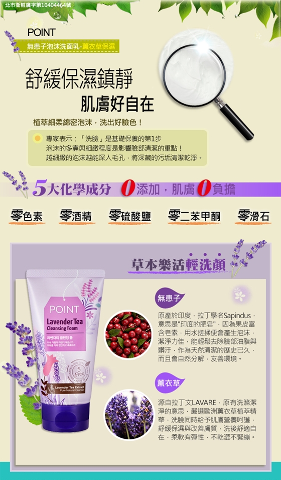 .....宅配草本樂活輕洗顏!天然無患子搭配薰衣草、綠茶、檸檬萃取,零添加,肌膚零負擔!細柔綿密泡沫,洗出好臉色!