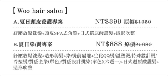 Oooooooops!換季時刻開始,沒有改頭換面怎麼行!地處交通方便捷運永春站,步行只要3分鐘,即刻遇見你的專屬美麗。寬敞舒適的環境、專業的態度與服務,擄獲不少都會人的心。設計師以獨到的眼光,針對每個客人的需求、臉型、風格,提出建議,趁著現在,來場大變革,換上新造型,迎接微涼的美麗秋日!