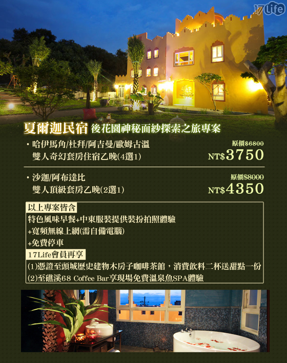 聚餐時刻又到了, 17Life-吃喝玩樂團購3折起,又讓愛聚餐的我們買不停吃不停,價格超殺,如果點進去已經售完別捶心肝喔!限時限量的團購券先搶先贏喔! 宜蘭五結獨特華麗異國風民宿!入住奢華中東主題房,品嶸S色風味早餐喚醒味蕾,還有中東服飾裝扮拍照體驗,完美享受