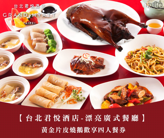 聚餐時刻又到了, 17Life-吃喝玩樂團購3折起,又讓愛聚餐的我們買不停吃不停,價格超殺,如果點進去已經售完別捶心肝喔!限時限量的團購券先搶先贏喔! 台北君悅酒店《漂亮廣式餐廳》-黃金片皮燒鵝歡享四人餐券